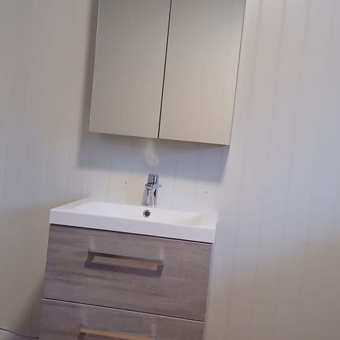 Baderomsinnredning fra KVIK med servant i hvit utførelse. Innredningen var ny i 2012 og består av en vegghengt servantskap-løsning med integrert servant og fire skuffer for oppbevaring. Armatur og tilhørende rørkoblinger medfølger.
