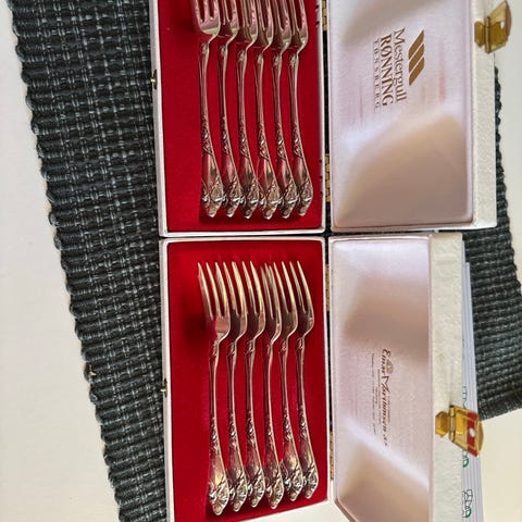 Seks stk kakegafler i mønsteret «ophøiet rose» fra Th. Martinsen sølvvarefabrikk.