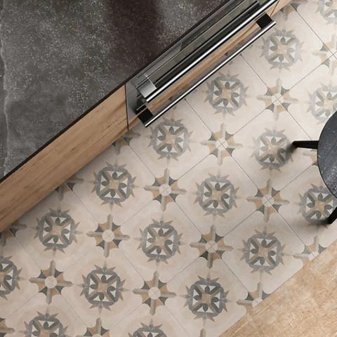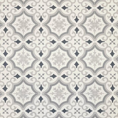 Flisene har trykt dekor med ulike geometriske og ornamentale mønstre i gråtoner. Undersiden er selvklebende, slik at flisene kan legges direkte på et rent og jevnt underlag. Egnet for innendørs bruk på gulv i tørre rom der man ønsker et mønstret vinylgulv med flis-look.