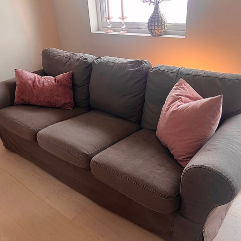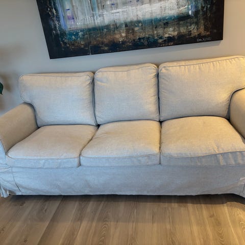 Sofa/rammen er hel og fin, trekket er også i god stand. Noen kloremerker fra katt frempå 2 av armlen. Katt har lagt på eget pledd på sofa. Trekket kan skiftes til ønsket farge. Se ikea. En veldig god og rubust sofa med medium mykhet og god støtte. Putene kan byttes og vendes. Se mål på bilder.