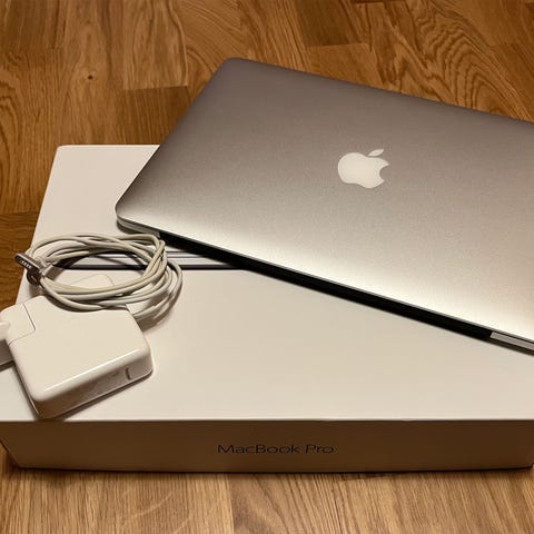Kjøpt i 2017 via Finn. Det er noen merker på undersiden fra tidligere, som kan sees på bildene. Leveres i original eske med strømforsyning. Gummien på kabelen har blitt litt tørr over tid og har flasset litt, derfor er den teipet, men fungerer helt fint. Jeg inkluderer også en ekstra strømforsyning, en Belkin Mini DisplayPort til HDMI-kabel for ekstern skjerm, samt et Incase-etui som passer perfekt.