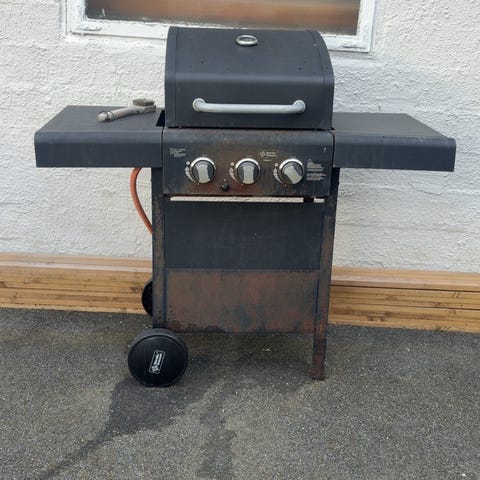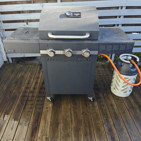 Gassgrill med tre hovedbrennere og lokk. Grillen har to faste sidebord, hjul for enkel flytting og dryppbrett under grilldelen. Egnet for bruk med gassflaske via tilkoblet gasslange og regulator. Passer til grilling av kjøtt, fisk og grønnsaker på terrasse eller uteplass. Fungerende temperatur-måler.