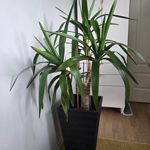 Planten er 240 cm høy i potte, med kraftig og dekorativ stamme. Stor grønn elefantfot palme som er 10 år og sunn. Planten står i potte og er egnet som stueplante eller til andre rom med god plass og naturlig lys.