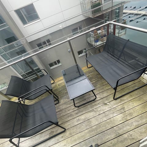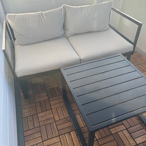 Hagegruppe i ukjent merke med sofa, to stoler og bord. Møblene har svart metallramme med armlener i lyst treverk og løse, grå sitte- og ryggputer. Settet er egnet for bruk på terrasse, balkong eller i hage som sittegruppe. Bordet har plate i glass. Designet er åpent og lett, med rette linjer og moderne uttrykk.