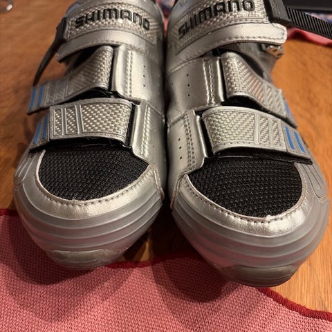 Shimano sykkelsko i størrelse 45, små i størrelsen. Modellen er laget for bruk med SPD-klikkpedaler. Skoene har borrelåslukking og overdel i syntetisk materiale med nettingfelt for ventilasjon. Fargen er grå med svarte detaljer. På bildet følger det også med et par SPD-oversko som kan brukes som trekk utenpå sykkelskoene for ekstra beskyttelse mot vær og vind.