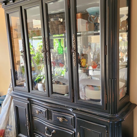 Flott skap med 6 skuffer, 3 skap med 6 hyller og dør. 4 hyller med glassdør og lys.