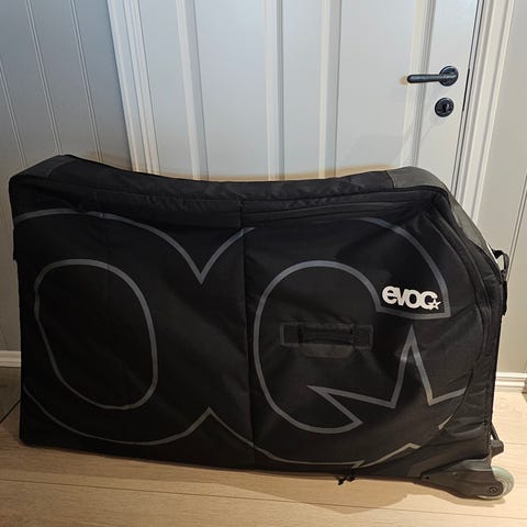 EVOC sykkelkoffert. Har litt bruksmerker etter en del reiser, men fortsatt i god stand og gjør jobben! Aldri opplevd at sykkel blir skadet i transport med denne.