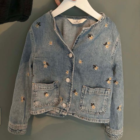 Name it denimkjole for jente i størrelse 104. Kjolen er i blå denim med broderte detaljer og har lange ermer. Den har krage, knepping foran og to påsydde lommer foran. Kun brukt en gang.