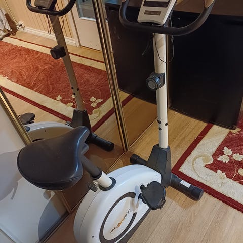 MaxFit trimsykkel i hvit farge. Sykkelen har justerbar motstand med manuell dreieknapp og integrert treningscomputer med display som viser grunnleggende treningsdata som tid, hastighet, distanse og estimert kaloriforbruk. Setet er høydejusterbart for tilpasning til bruker. Egnet til innendørs kondisjons- og mosjonstrening.
