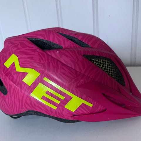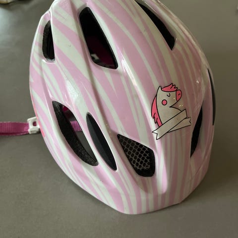 Lazer Gekko. Pent brukt av to barn, pent behandlet. Justerbar sykkelhjelm fra 46 til 50 cm. Barna her har brukt denne fra de var ca ett til 3-4 år.