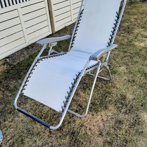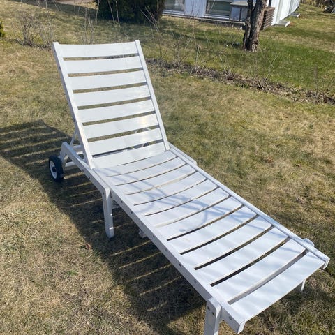 Ryggdelen kan justeres i 3 ulike posisjoner. Det er desverre et mindre hull i stoffet nederst på liggeflaten, som vist på bilde. Dette synes ikke om du bruker trekket over. Pent brukt og lagret innen dørs, men noe rust i festene.