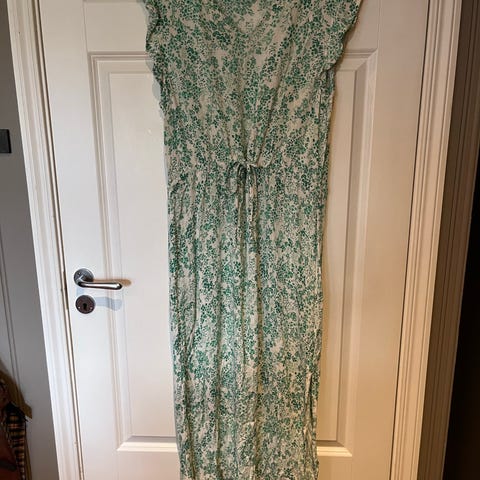 ICHI sommerkjole i størrelse M. Kjolen er laget i viskose og har et flerfarget mønster med grønt og hvitt. Modellen er ermeløs med V-utringning og en knapp foran, samt knyting i midjen for bedre passform. Lengden er ankellang/maksikjole. Stoffet er lett og mykt, egnet til bruk på varme dager. Material- og vaskeinformasjon fremgår av lappen på innsiden av plagget.