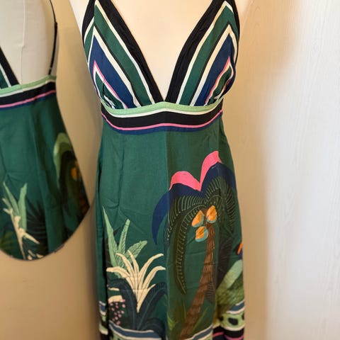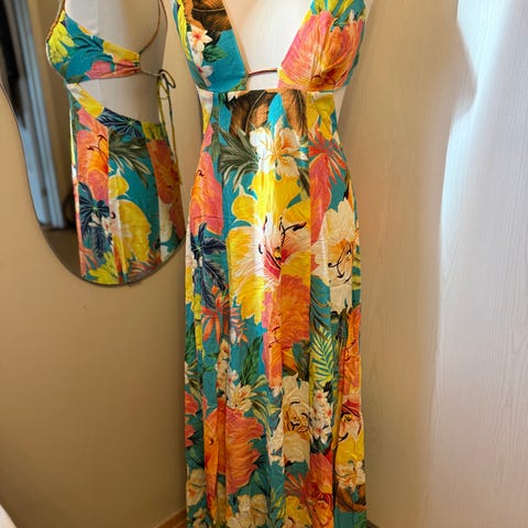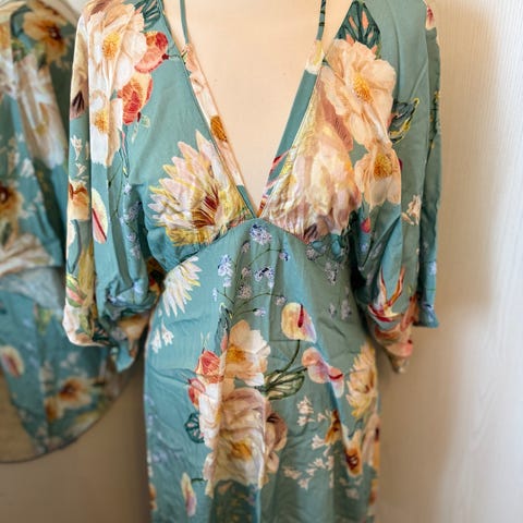 Lett kjole laget i viskose med blomsterprint. Kjolen har snøring under midje for justering og strikk i livet, kjolen har fine vide ermer og et livlig, feminint uttrykk. Størrelse medium. Kun brukt et par ganger, men fremstår som ny. ☺️