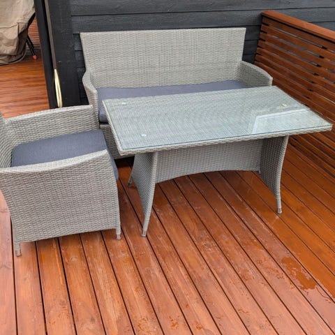 Hagesett loungesofa med to stoler og bord i mørk grå kunstrotting. Settet består av en toseter sofa, to lenestoler og et lavt bord. Møblene har flettet kunstrotting i mørk grå farge og løse sitteputer i lys grå tekstil. Bordet har flat overflate som kan brukes som avlastningsbord. Settet er egnet for bruk på terrasse, balkong eller i hage som sittegruppe til utebruk.