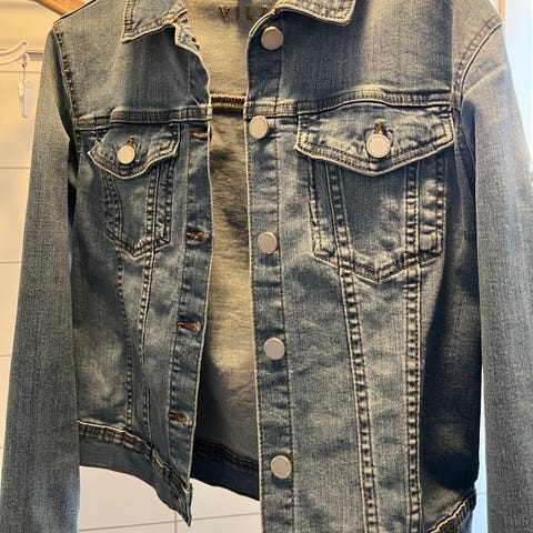 Vero Moda dongerijakke for dame i størrelse S. Jakken er i blå denim med klassisk krage, knappelukking foran og brystlommer med klaff og knapp. Modellen har lange ermer med mansjetter og justerbar knappelinning nederst. Passer som ytterlag over ulike antrekk i hverdagen.