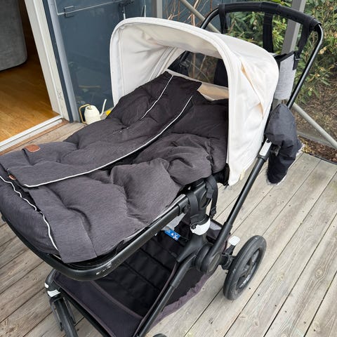 Det er en liten knapp på sittedelen som fester midt beltet til vognen som må kjøpes på nytt, eller festes med noe annet (strips f.eks.), litt maling på ene stroppen på vognen.