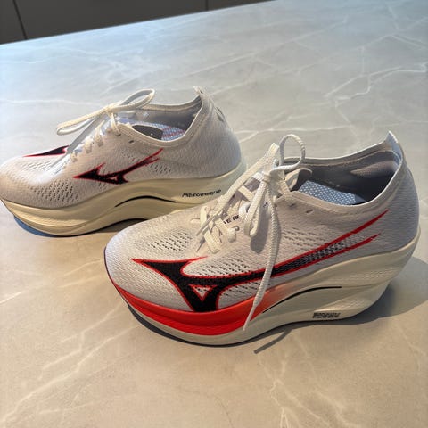 Strøkne Mizuno Neo Vista 2. Kun brukt én rolig løpetur på 15 km, der jeg dessverre innså at de er hakket for store for meg. Disse er altså så godt som nye. Koster 2400 kroner nye. En super og alsidig løpesko som kan brukes til både korte, lange, rolige og raske turer.