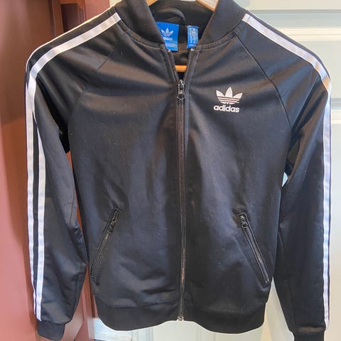 Selger en pent brukt adidas Originals SST track jacket i fargen mørkeblå (navy). Dette er den ikoniske modellen med den klassiske Trefoil-logoen på brystet og de tre hvite stripene nedover ermene.
