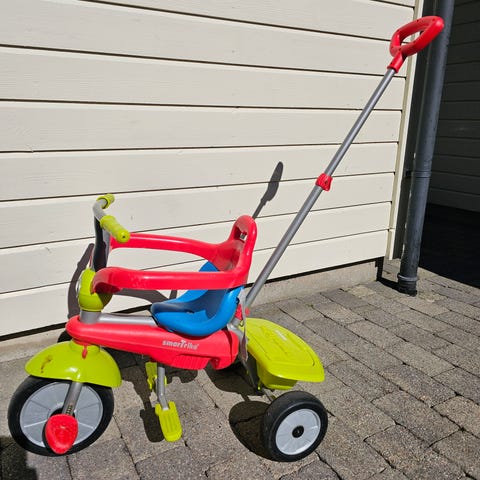 Smoby trehjulssykkel med bøttesete. Trehjulssykkelen har plastsete med rygg og enkel sele, samt bøtte/bagasjebrett bak. Styret har rette håndtak, og sykkelen har tre solide hjul. Egnet for små barn som skal øve balanse og sykling på trehjulssykkel.