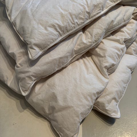 Lite og pent brukt dun barnedyne (100 x 140) og -pute (40 x 60) selges sammen med sengesett.