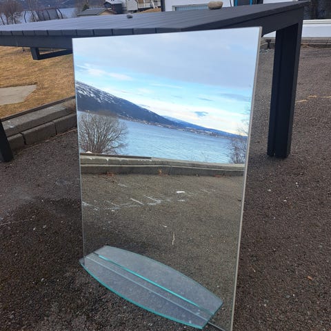 Speilskap til bad med to speildører. Skapet har innvendige hyller for oppbevaring av toalettartikler og lignende. Yttersiden består av speilglass, mens innsiden er i lys overflate. Egner seg for montering på baderomsvegg over servant eller lignende bruksområde.