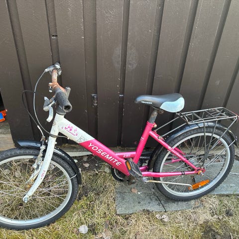 Barnesykkel med 20" hjul. Sykkelen har hvit ramme med rosa detaljer og er utstyrt med gir og håndbremser foran og bak. Knastedekk gir godt grep på variert underlag. Sete og styre er tilpasset barn.