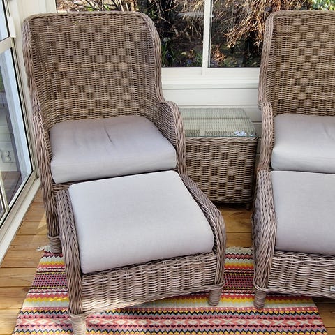 2 stoler med puff har stått ute under tak.