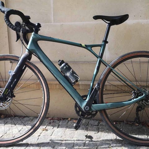 Dette er en solid og komfortabel karbonramme med et open mold-design som også er brukt på syklene Wilier Jena og Merida Silex (i karbon) - det sier litt om kvaliteten på dette designet. Den er lakkert i en dyp grønn "sparkle"/kameleon-farge som virkelig skinner i sola.