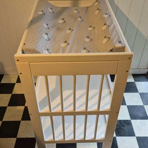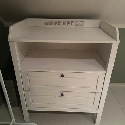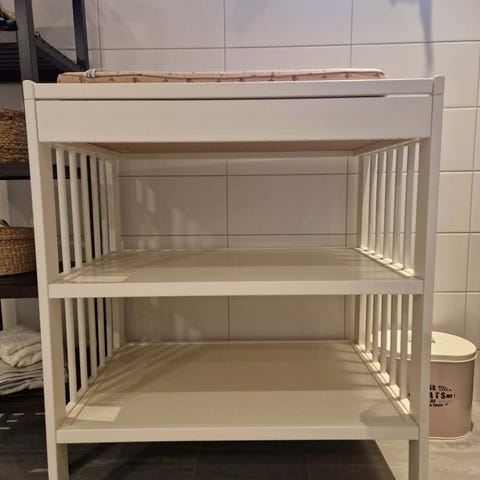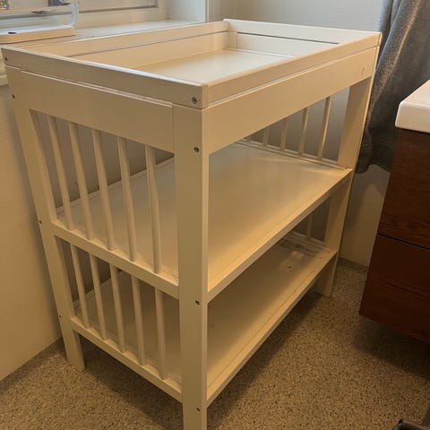 IKEA stellebord i hvit farge. Stellebordet har en åpen løsning med to hyller under stelleflaten som gir plass til oppbevaring av bleier, klær og annet utstyr til baby. Egnet for bruk på barnerom eller bad der man trenger en fast stelleplass.