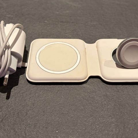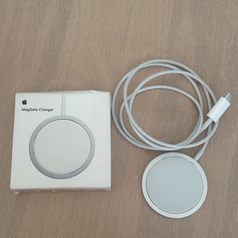 Apple MagSafe Battery Pack lader i hvit farge. Trådløs batteripakke som festes magnetisk på baksiden av kompatible iPhone-modeller med MagSafe. Enheten fungerer som en ekstern strømreserve og lader telefonen trådløst via innebygde magneter. Passer for bruk som ekstra lader på farten eller som supplement til vanlig lader hjemme eller på jobb.