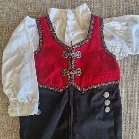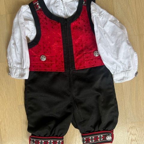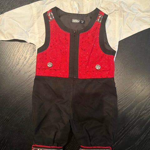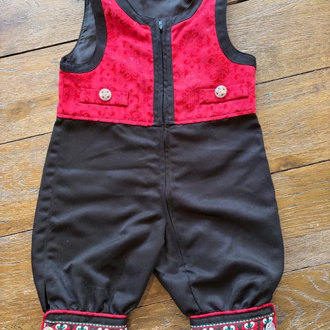 Reflex selebukse for barn i størrelse 74. Buksen er i svart bomull med røde detaljer og mønstrede bånd nederst på bena. Modellen er unisex og har glidelås foran for enkel av- og påkledning. Egnet som penbukse eller til bruk ved høytider og spesielle anledninger.