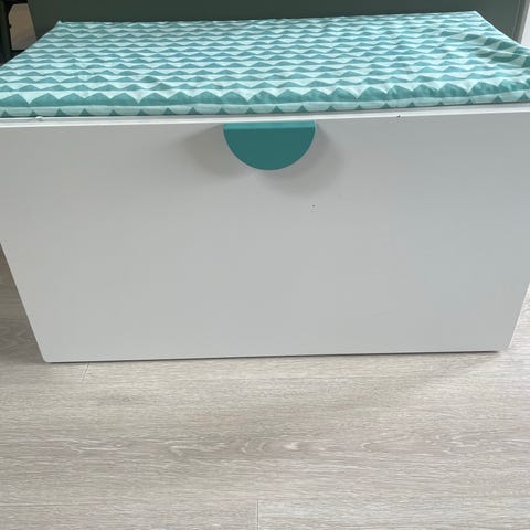 IKEA oppbevaringsbenk med plastkasser i hvit. Benken har tre åpne seksjoner med uttrekkbare plastkasser i ulike størrelser. Kassene er i lyse farger, blant annet gult og grått. Møbelet er egnet som oppbevaring på barnerom, lekerom eller gang, og kan brukes til leker, klær eller annet utstyr. Benkeplaten kan også fungere som sitteplass eller avlastningsflate.