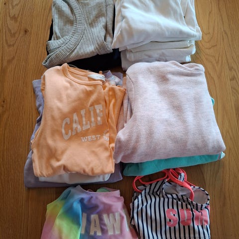 Inneholder 2 kjoler,svart skjørt,nike shorts,singletter,t-shirt,tynne gensere,hettegensere,velour dress fra wow,bukser.Str.er 164-XS-S.