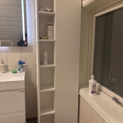 Baderomsskap høyskap med speildører i hvit utførelse. Skapet består av to høye seksjoner med flere åpne hyller og to nedre skap med dører. Øvre del har speildører som åpnes til siden, med hyller bak for oppbevaring av baderomsartikler. Nedre del har lukkede skapdører for skjult lagring. Skapet er beregnet for plassering på bad, over eller ved siden av servant eller vaskesone, og gir god oppbevaringsplass til håndklær, toalettartikler og rengjøringsmidler.