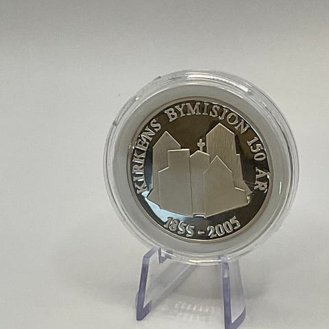 Kirkens Bymisjon 150 år minnemynt og førstedagsbrev. Sett med minnemedalje og konvolutt med frimerker og stempel som markerer 150-årsjubileet for Kirkens Bymisjon. Egnet for samlere av mynter, medaljer og filateli, samt for dem som ønsker dokumentasjon knyttet til jubileet. Inneholder presentasjonsmappe med integrert medalje og illustrert førstedagsbrev.