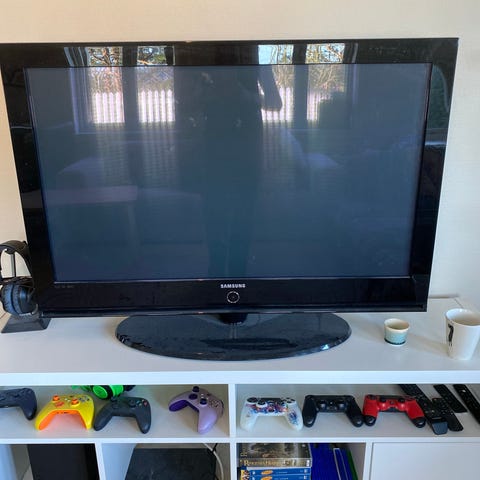 LG TV. Flat skjerm med innebygde høyttalere og tilkoblingsknapper på siden. Lyden bør man ha en lydplanke