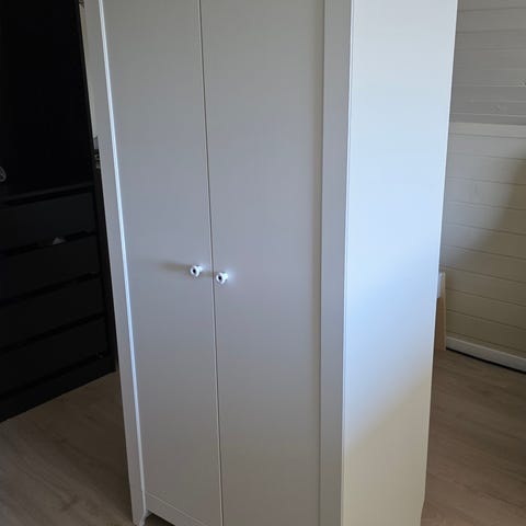 IKEA klesskap til barnerom. Innvendig er det klesstang til oppheng av klær og plass til oppbevaringsbokser eller lignende nederst. Server to hyller (ikke en som på siste bildet). Egnet til oppbevaring av barneklær og tilbehør på barnerom.
