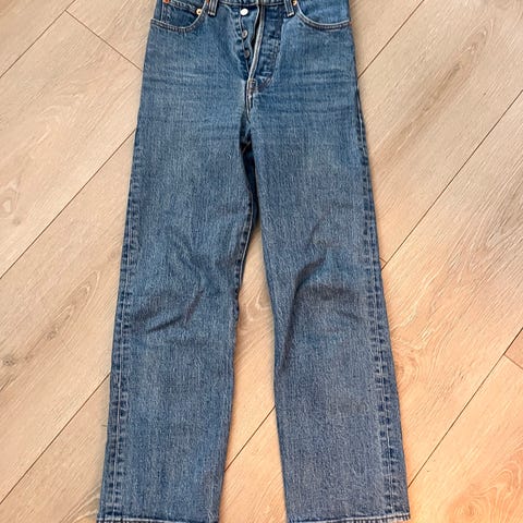 Levi's Ribcage Straight jeans for dame i blå denim. Buksen er i størrelse S med livvidde W26. Materiale i bomull. Klassisk femlommersmodell med rett ben og gylf med knapp. Passer til hverdagsbruk og kan kombineres med ulike overdeler for et enkelt og nøytralt uttrykk.