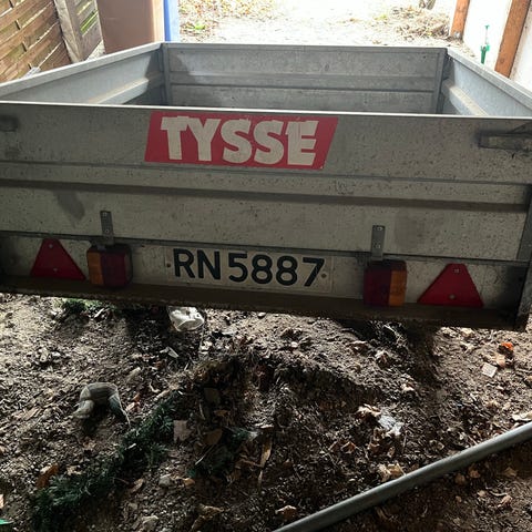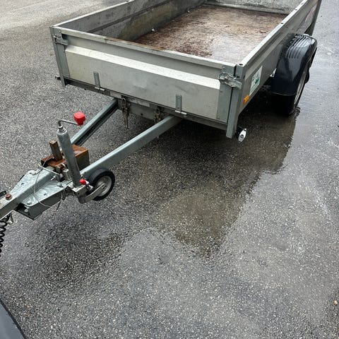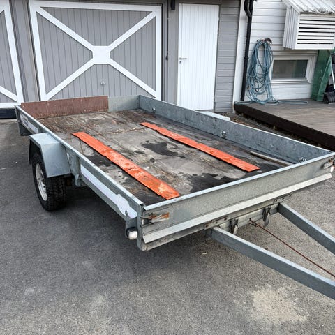 Tilhengeren er restaurert, nye lamper, 4 nye dekk, ny bunnplate 15 mm. Innvendige boksmål 250 cm - 150 cm. Bremsesystemet må byttes metallvaiere. Totalvekt 1400 kg.