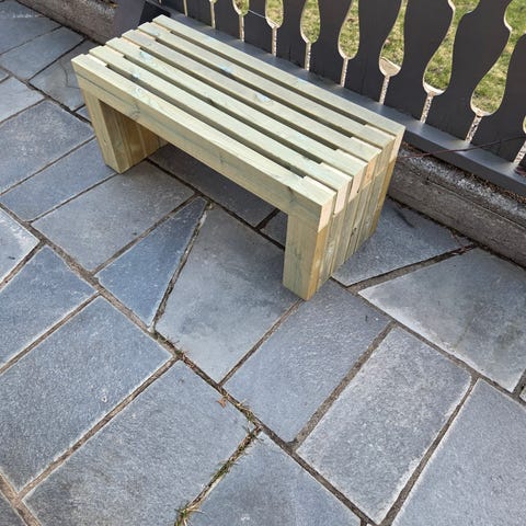 Solid benk av trykkimprignerte materialer. Lages i 120 cm (45cm høy, 40 cm bred), eller annen størelse på bestilling. Levering mot ekstra betaling.