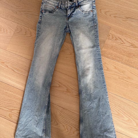 Vid jeans med høyt liv. Mørkgrå denim. Litt stretch.