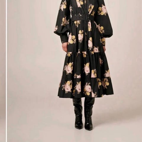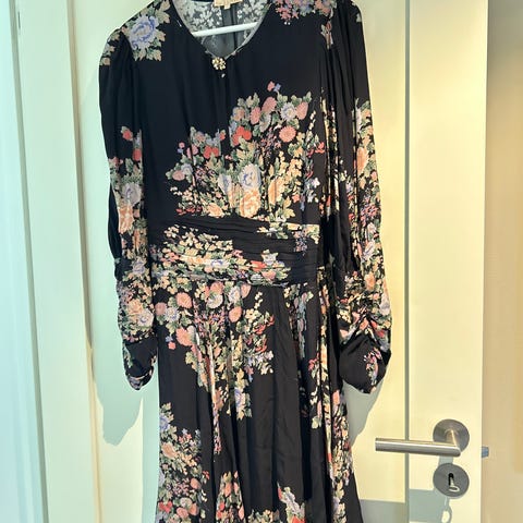 Kjolen er svart og laget i bomull. Den har krage og knepping foran hele veien. Modellen har lange ermer med mansjetter og knapper. I livet er det et bredt belte med spenne, samt innfelt strikk som gir form. Skjørtet er voluminøst med flere lag/volanger. Kjolen har også sidelommer.