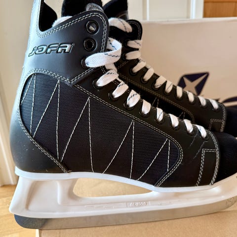 CCM ishockeyskøyter i størrelse 45. Skøytene er i hovedsak svarte med hvite lisser og detaljer i kontrastfarger. De har stabile plastskaft og hvite skøytestålholdere. Egner seg til ishockeyspill og generell skøytebruk på isbaner. Passer for brukere som trenger ishockeyskøyter i størrelse 45.