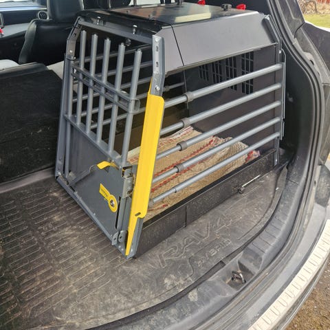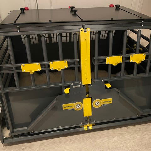 Det er gittervegger og dør med låsemekanisme i front. Utformet for å stå stødig mot bakseteryggen og har skrå bak- og frontside som tilpasses vinkelen i bilens bagasjerom. Luftige gitteråpninger gir god ventilasjon for hunden under kjøring.