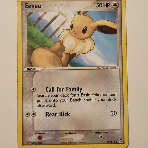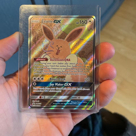 Pokémon Eevee GX samlekort. Kortet viser Eevee som GX‑pokémon med illustrasjon på forsiden og standard blå Pokémon-bakside. Egnet for samling og spill i Pokémon Trading Card Game. Eventuell utgave, språk, sett og tilstand bør kontrolleres visuelt av kjøper basert på bildene. Tar trades😁