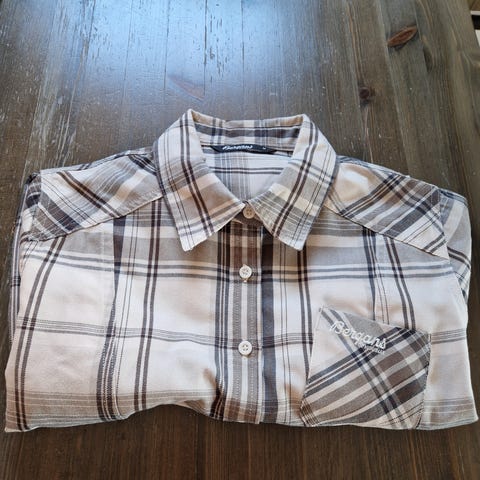 Bergans Wool T-skjorte for dame i størrelse M. T-skjorten er beige og laget i ull. Modellen har rund hals og trykket Bergans-logo på brystet. Egnet som lett ulltrøye eller T-skjorte til hverdagsbruk og friluftsaktiviteter.