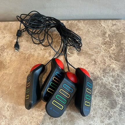 Sony Buzz kontrollere for PlayStation 2 og 3. Sett med fire kablede håndkontrollere i svart med rød buzzer-knapp og fire fargede svar-knapper på hver enhet. Kontrollerne kobles til PlayStation 2-konsollen via medfølgende kabel og er beregnet for bruk sammen med Buzz-spillene til PS2. Egnet for flerspillers quiz- og partyspill der hver spiller bruker sin egen Buzz-kontroller.