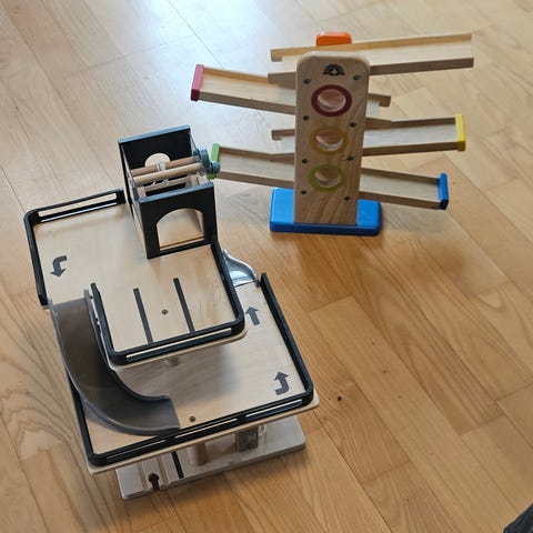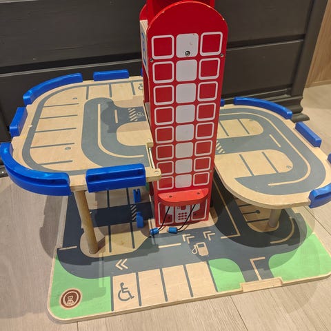 Lekesettet består av parkeringsplasser, kjøreramper og veibaner trykket på treplaten. Øverste nivå har helikopterlandingsplass markert med H. Huset har heis- eller tårnstruktur i midten, med påmalte vinduer og parkeringssymbol.