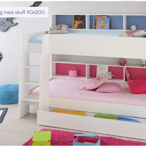 Super køyeseng med masse plass til leker, bøker og oppbevaring, evt gjesteseng (seng nr 3). Fra produsenten Parisot i Frankrike. Køyesengen er ca 4 år gammel og to madrasser medfølger. Har også en ny overmadrass (2 mnd) som kan fås med uten ekstra betaling. Nypris seng er 13-14.000,- pluss madrasser.