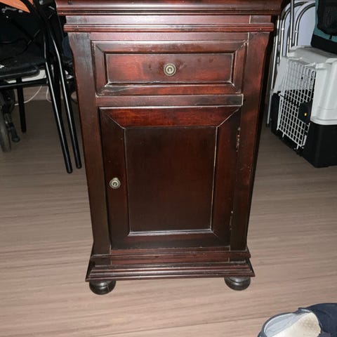 Selger ett nattbord (passer også fint som hjørnebord). Blir nok fin igjen med ett par strøk maling (eller ikke).